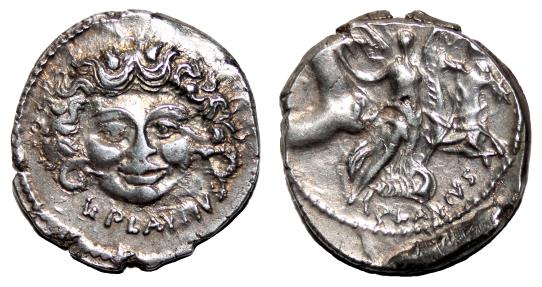 Obverse: Head of Medusa facing; with coiled snake on either side; below, L·PLAVTIVS.