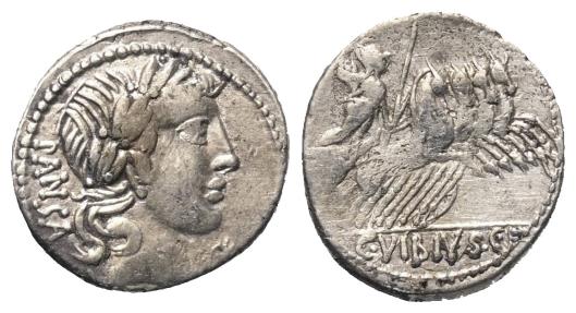 Rev.: C VIBIVS C F. Minerva with spear and trophy driving a galloping quadriga to the right.