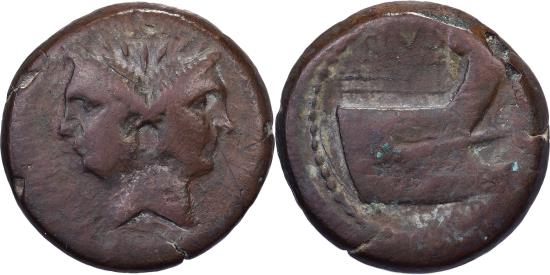 | | Sextus Pompey, As, 45 BC, Sicilian Mint, Bronze, , RPC:I-671 | | | Laureate head of Janus, with features of Pompey the Great., Prow, right., M͡AGNVS (M͡AGNV, M͡AGN, MGN), PIVS IMP | | FEATURES |