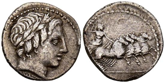 ANONYMOUS COINAGE. Denarius. (Ar. 3.72g/19mm). 86 Fine Rome. (FFC 85; Crawford 350/A2). Obverse: Laureate head of Apollo Vejovis facing right, below a bundle of lightning bolts. Reverse: Jupiter riding in a chariot and throwing a lightning bolt to the right. VF.