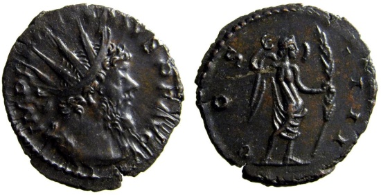 v296 Postumus Mint: Cologne Obv: IMP C POSTVMVS PF AVG Radiate bust right, draped. Rev: COS IIII Victory, standing, half naked, with wreath and palm 2.99g, 21mm Attribution: RIC V (2) #287, RSC 31a, Sear III 10932 VF/EF. Sharp and clear bust, sharp reverse. |